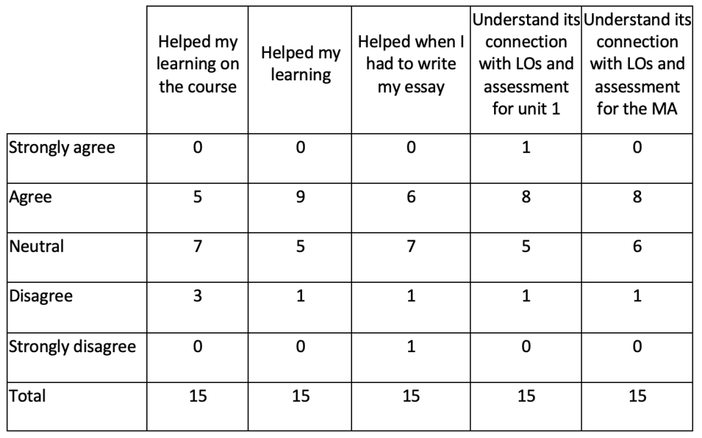 This is an interesting revelation as it sends the argument in full circle. My intervention started because we lacked a clearly defined cluster of timetabled sessions introducing theory and aimed at supporting the critical analysis and essay writing part of the course. As something ‘thrown together’ quickly to cover a teaching gap it had a surprisingly positive impact overall but it also shows that taking the time to really unpack new knowledge and verify that the students understand why they are learning something and how to use it is paramount to successful teaching.