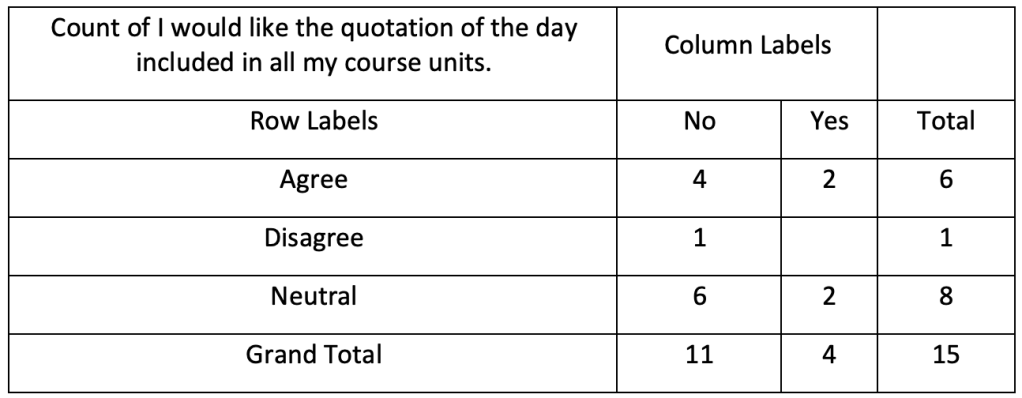 Roughly the same sample that engaged with the QD and found it useful agreed that the QD should be part of all of the course units (6) or showed neutral feelings about it (8). Only one, presumably the same one, disagrees. A pivot table analysis of the data by prior knowledge of contextual theory looks like this: