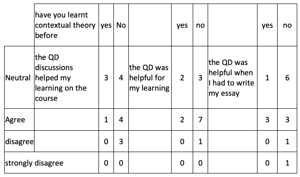 An interesting finding is that the person who strongly disagreed with the usefulness of the QD for the essay task is also the only person who claimed to have understood the topic very well. They had no prior knowledge of critical theory, answered that the QD helped their learning on the course (although they are neutral about its connection with the learning objectives and assessment criteria) and chose to engage with the topic after class, by talking to peers and referring to the source of the quotation. The person does not refer to the knowledge gained very often (eg for their reflective and critical writing). They asked to read more books on critical theory and made no suggestions on what the teacher could do to improve their learning experience.