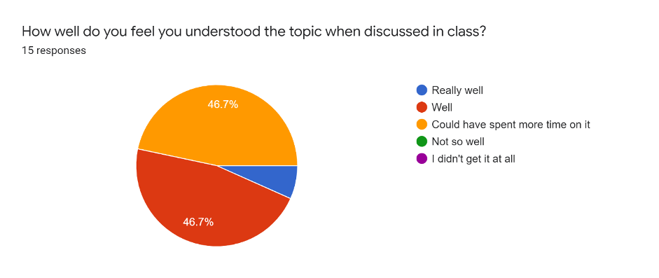 - Spend more time on the discussions and, as above, discuss more examples. This coincides with one of my questionnaire findings: a number of students answered that their learning would have been helped if we had spent more time on the discussions.