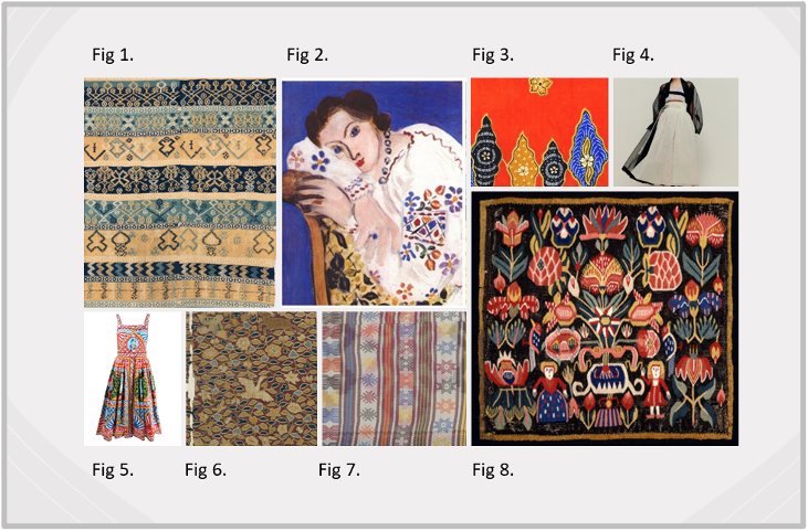 In this piece, I have taken this structure apart by cutting the fabric to include imagery that students could bring to the classroom from Korea, Malaysia and China and underrepresented voices from Cyprus, Norway and Sweden. In this way, decolonizing the curriculum involves creating an opportunity for students to share their cultural perspectives, taking a social constructivist approach. French artist Matisse’s painting of a Romanian blouse has been included to acknowledge the value of students bringing their own cultural references not cultural imagery presented through a Western lens. It also acknowledges the importance of students’ understanding of ‘cultural appropriation’ on fashion trends.